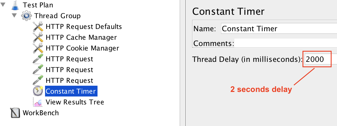 JMeter có một bộ Bộ hẹn giờ, cho phép người dùng thiết lập thời gian tạm dừng giữa các yêu cầu khác nhau. Trong ví dụ này, sẽ thêm Constant Timer để tạo độ trễ trong khoảng thời gian cố định.