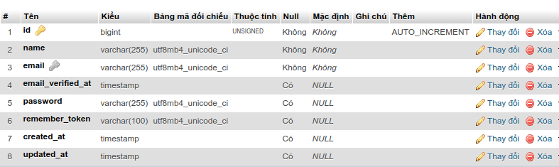 - Trước hết ta tạo một bảng users: gồm các trường bắt buộc phải có và không thay đổi nhưng (name, email, password...) bảng này trong mô hình EAV gọi là bảng Entity (thực thể)