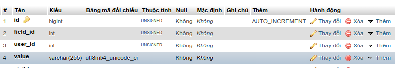 - Bảng cuối cùng là bảng user_values: bảng này có các cột user_id, user_field_id, value. Dùng để lưu các giá trị của user tương ứng với các thuộc tính ở bảng user_fields , ví dụ ở bảng user_fields có thuộc tính phone thì bảng user_values dùng để lưu giá trị phone của user là gì.