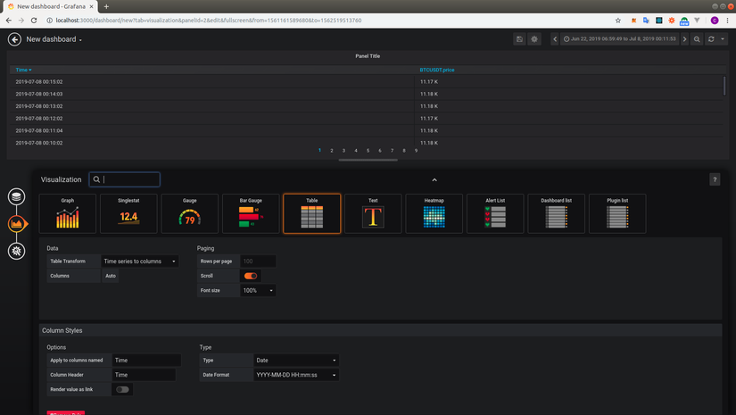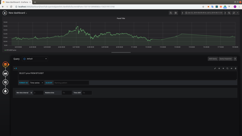 Câu query của mình khá đơn giản, chỉ là lấy toàn bộ dữ liệu đã store lại về giá của đồng bitcoin, dữ liệu đã được mô hình hóa một cách trực quan, các bạn có thể lựa chọn xem chi tiết từng mốc thời gian bằng cách quét chuột các mốc thời gian hoặc lựa chọn dựa trên dropdown phía góc phải màn hình, sức mạnh của Grafana ở việc có thể hiển thị giá trị tới từng giây.