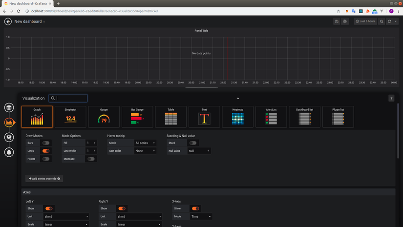 Sau các bước trên thì chúng ta đã config tương đổi ổn để có thể vizualizate dữ liệu, bước tiếp theo là tạo một Dashboard bằng cách click vào biểu tượng dấu Cộng phía sidebar bên trái, màn hình sẽ được thay đổi về giao diện giúp xây dựng Dashboard: