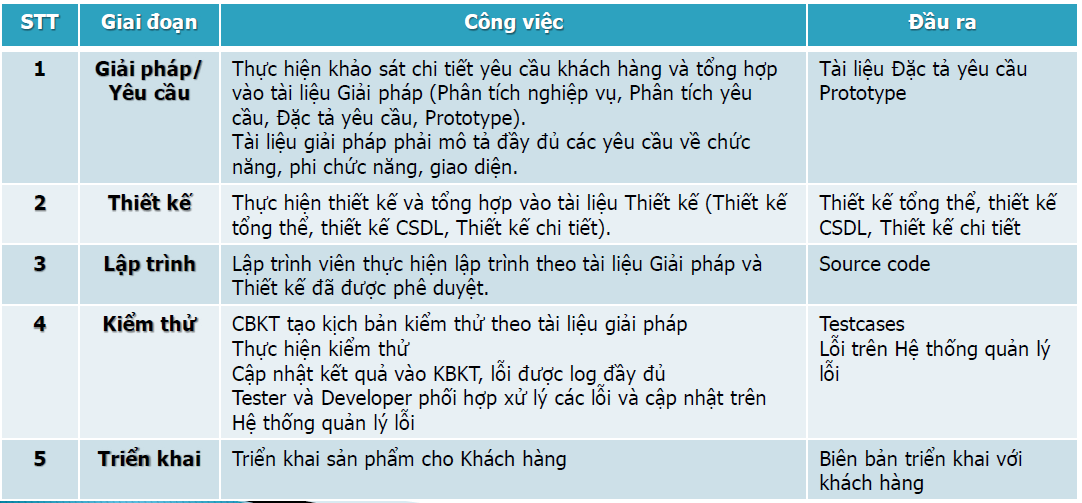 Toàn bộ quy trình được chia thành 2 giai đoạn tương ứng nhau: Phát Triển và Kiểm Thử