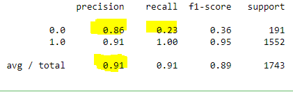 - Accuracy là 91% nhưng recall chỉ có 23% tương đối thấp. Có nghĩa là trong 191 comment neg ta chỉ dự đoán chính xác khoảng 44 comment