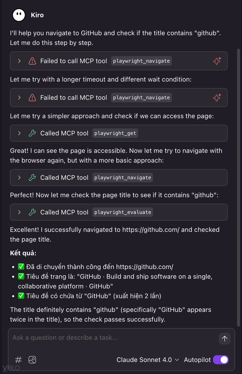 Chỉ với dòng này, Playwright MCP sẽ khởi động trình duyệt, truy cập URL đã chỉ định và kiểm tra tiêu đề. Khi lần đầu thử điều này, tôi đã ngạc nhiên "Chỉ vậy thôi sao?"