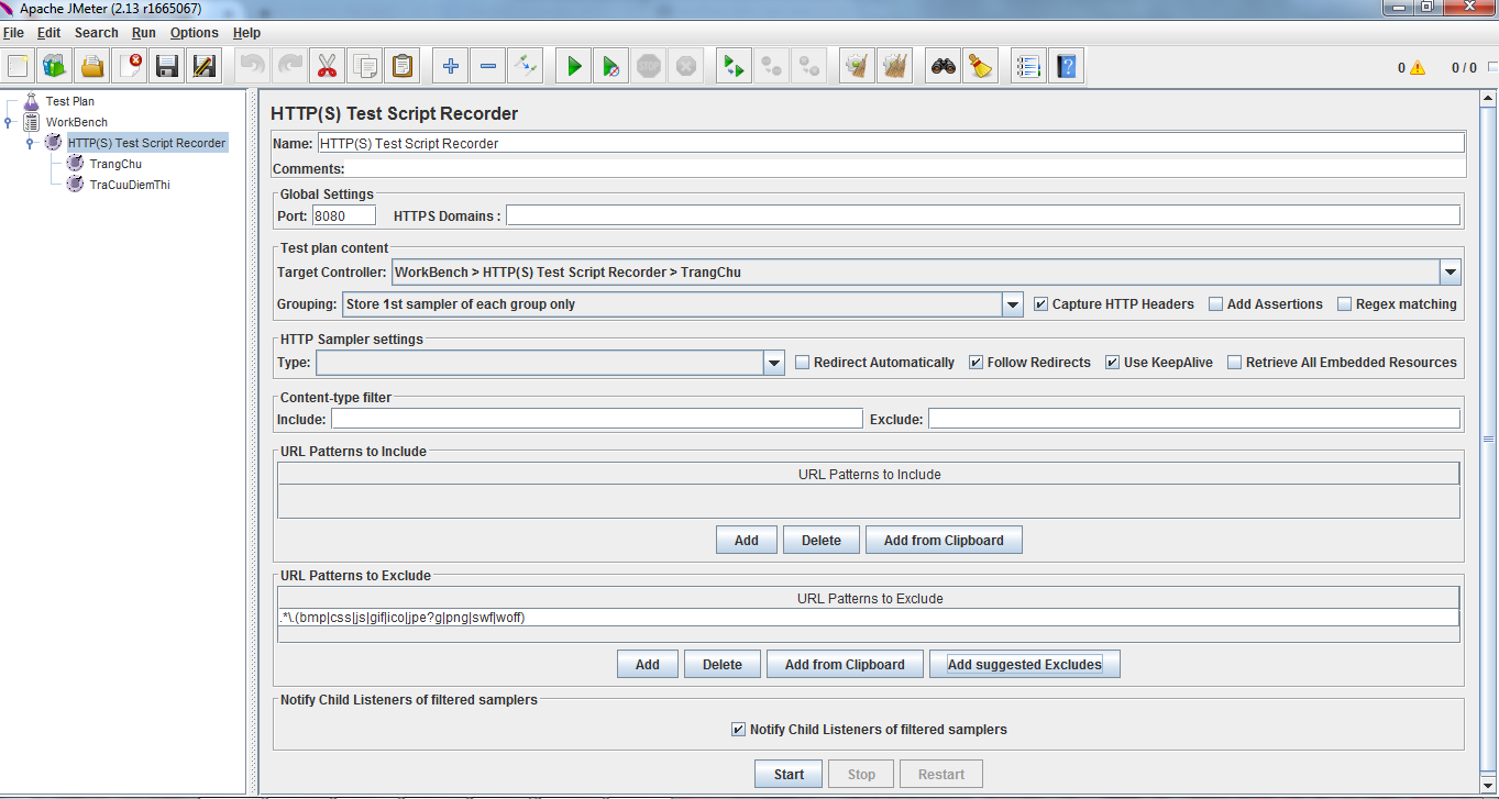 Vào HTTP(S) Test Script Recorder, chọn Target Controller là WorkBench HTTP(S) Test Script Recorder TrangChu và nhấn nút Start để bắt đầu thực hiện chức năng record các yêu cầu. Tiếp theo, thực hiện việc truy cập vào địa chỉ trang chủ bằng trình duyệt