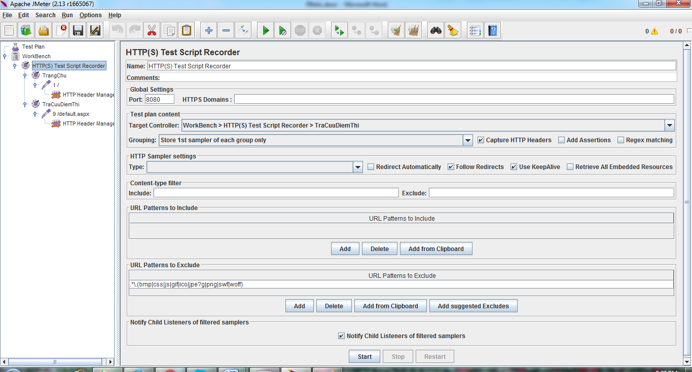 JMeter cung cấp công cụ HTTP(S) Test Script Recorder, công cụ này có khả năng lưu lại những yêu cầu HTTP mà người dùng gửi đến server bằng cách ghi lại những bản ghi trong quá trình người dùng thực hiện những thao tác lên trình duyệt. Để ghi lại những yêu cầu này, ta cần thiết lập port cho HTTP(S) Test Script Recorder và thiết lập port tương tự ở trình duyệt để HTTP(S) Test Script Recorder có thể lắng nghe được những thao tác mà người dùng thao tác trên trình duyệt. Để sử dụng các chức năng mà HTTP(S) Test Script Recorder cung cấp, trong giao diện chính của JMeter, chọn WorkBench Add None-Test Elements HTTP(S) Test Script Recorder. Thiết lập thông số port là 8080 để ghi lại những yêu cầu HTTP khi người dùng thực hiện các thao tác trên trình duyệt. Các thiết lập được biểu diễn như hình sau: