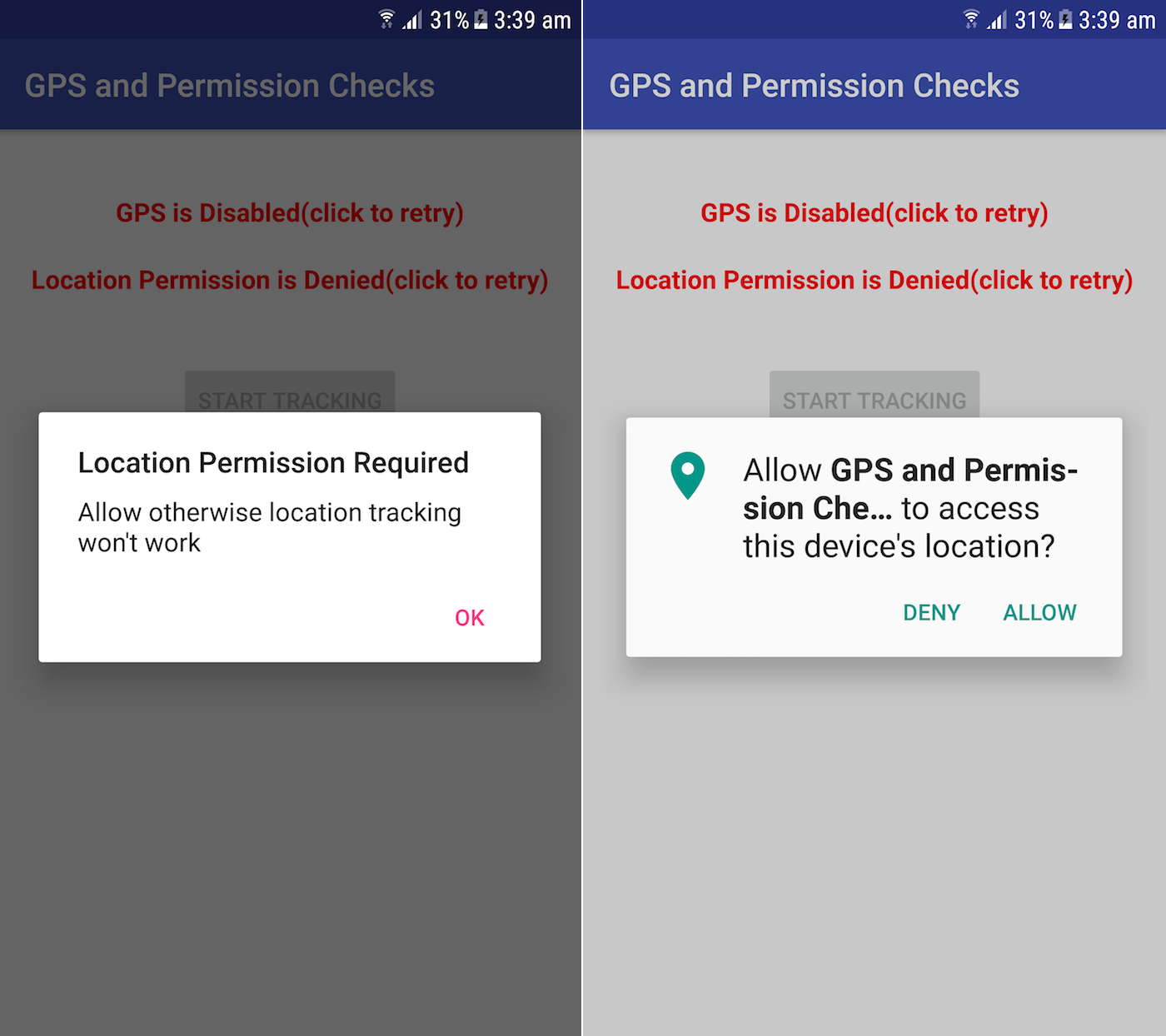 Cũng như, Location Permission được kiểm tra trước và sau khi GPS và dialog được giữ cho xuất hiện mỗi khi người dùng đưa ứng dụng vào trạng thái foreground. Điều này là hiển nhiên chỉ để trình bày làm thế nào UI có thể phản ứng lại với nó.