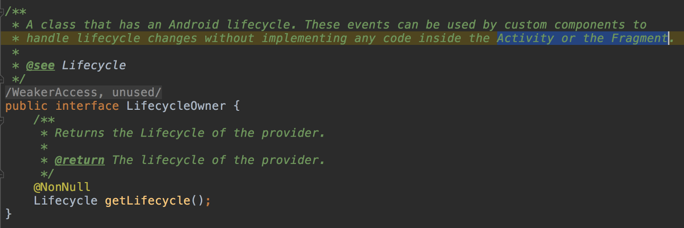 Trong trường hợp của chúng ta, chúng ta cần lắng nghe những thay đổi từ GPS và Runtime Permission LiveData bên trong LocationService. Nếu bạn đọc comments trong lớp LifecycleOwner bạn sẽ để ý thấy rằng nó không đề cập tới Service như là một ứng cử viên. Bây giờ phải làm ntn?