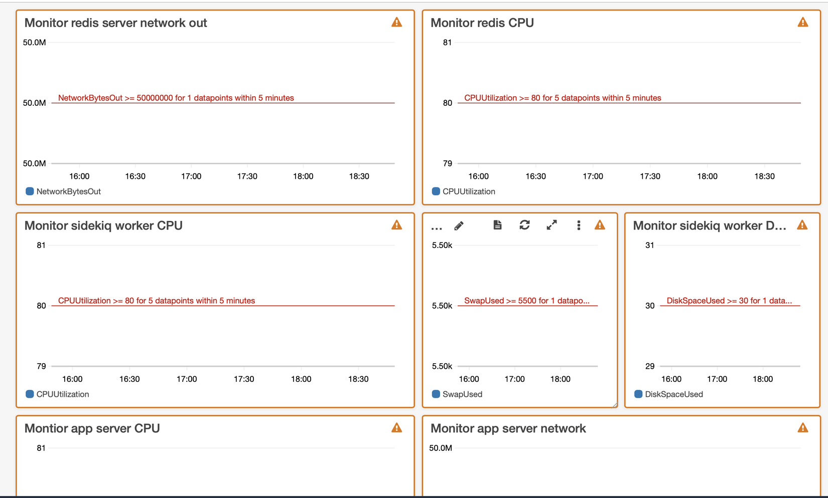 Dashboard : Cho phép tạo bảng điều khiển với biểu đồ và số liệu thống kê cho tất cả tài nguyên AWS, trên bảng điều khiển này chúng ta cũng có thể thiết lập nhiều dạng biểu đồ như lines, stacks, numbers: biểu đồ theo dõi redis server, sidekiq worker, app server CPU, app server network ...