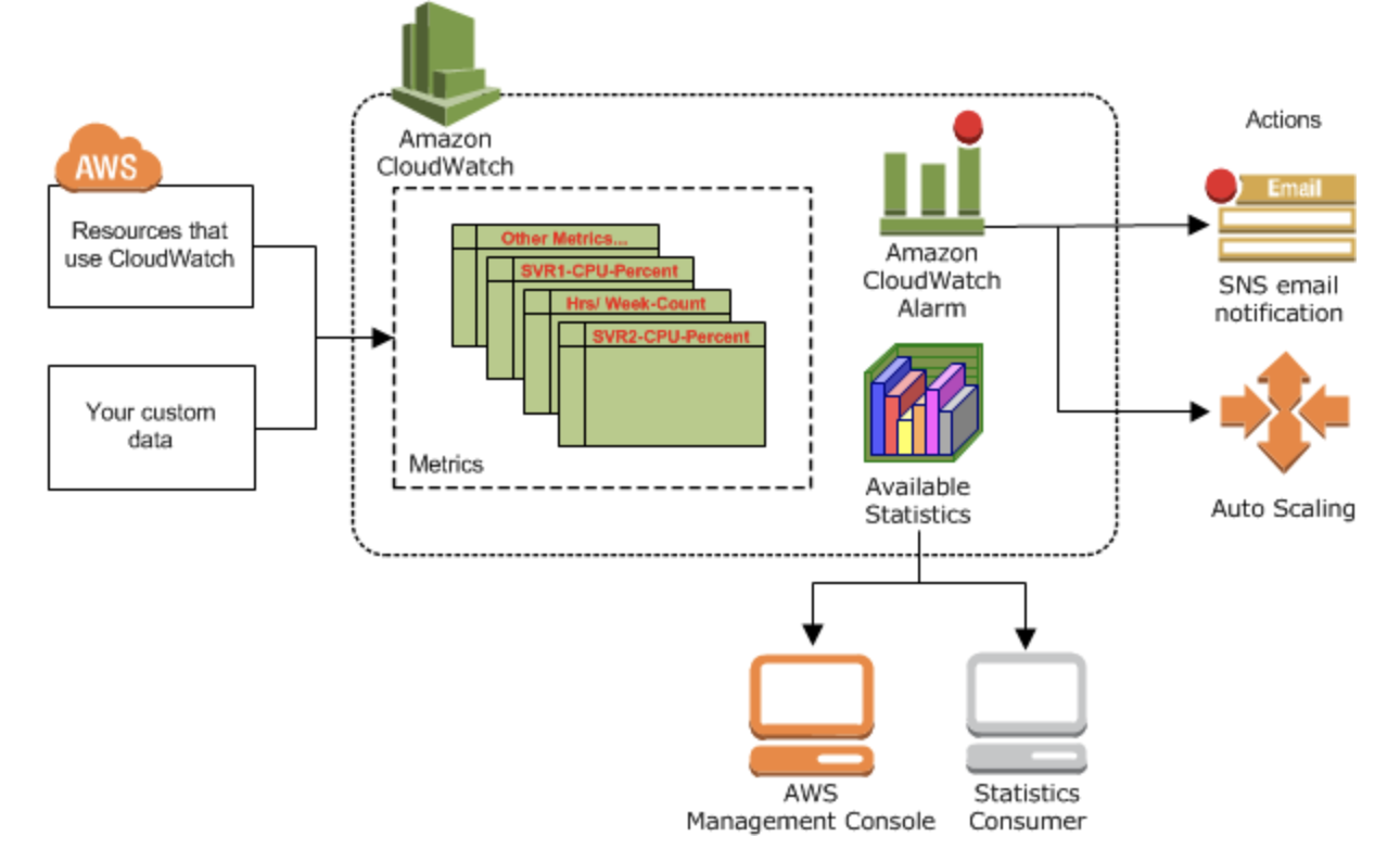 CloundWatch là một dịch vụ giám sát nhằm theo dõi, thu thập số liệu không chỉ của các tài nguyên trong aws mà còn cả ứng dụng của bạn trong thời gian thực. Bên cạnh đó chúng ta cũng có thể giám sát và thu thập log files, theo dõi hiệu suất, mức độ sử dụng, tình trạng sức khoẻ. CloudWatch không phân chia khu vực nên chúng ta có thể theo dõi tình trạng các instances ở area khác nhau trên cùng một bảng điều khiển. Với tính năng cơ bản, dữ liệu được cung cấp trong khoảng thời gian 5 phút, tuy nhiên với bản trả phí, bạn có thể chọn theo dõi chi tiết theo từng phút.