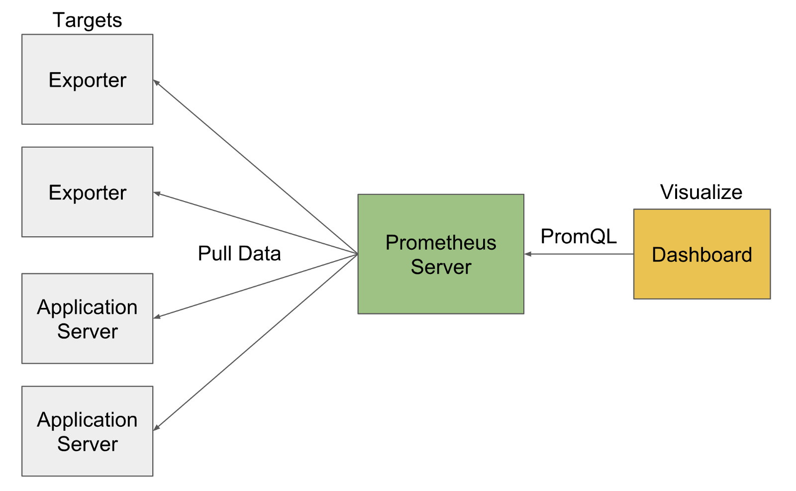 Prometheus có một component trung tâm để xử lý, gọi là master Server. Nó giúp chúng ta theo dõi các target servers thông qua việc: lấy dữ liệu từ các target server này như về CPU, sau đó lưu trữ vào 1 database dạng time-series. Chúng ta có thể sử dụng PromQL để query dữ liệu từ một hoặc nhiều target servers. Mặc định, Prometheus sẽ theo dõi chính nó (chính master server). Chúng ta có thể định nghĩa các rules/triggers và thông báo khi gặp vấn đề qua email, slack hoặc các alerting tool khác.
