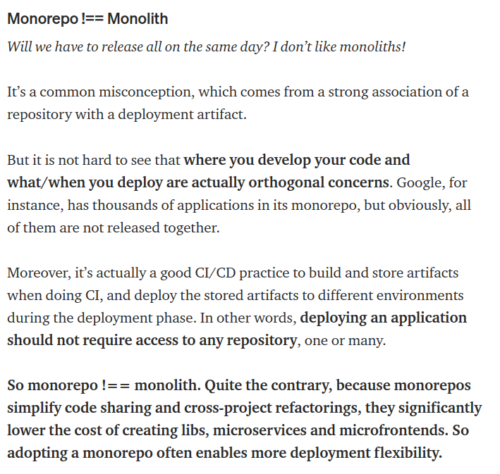 Lưu ý rằng việc triển khai dưới dạng mono-repo không hề đồng nhất với kiến trúc nguyên khối (monolith)