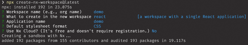 Sau khi chọn mẫu sẵn có phù hợp với nhu cầu của mình, Nx sẽ tạo cho chúng ta workspace mới. Ở đây mình chọn wokspace theo mẫu react để thử dùng Nx CLI - công cụ được Nx cung cấp để quản lý workspace mà mọi người có thể cài đặt bằng cách dùng câu lệnh npm install -g nx