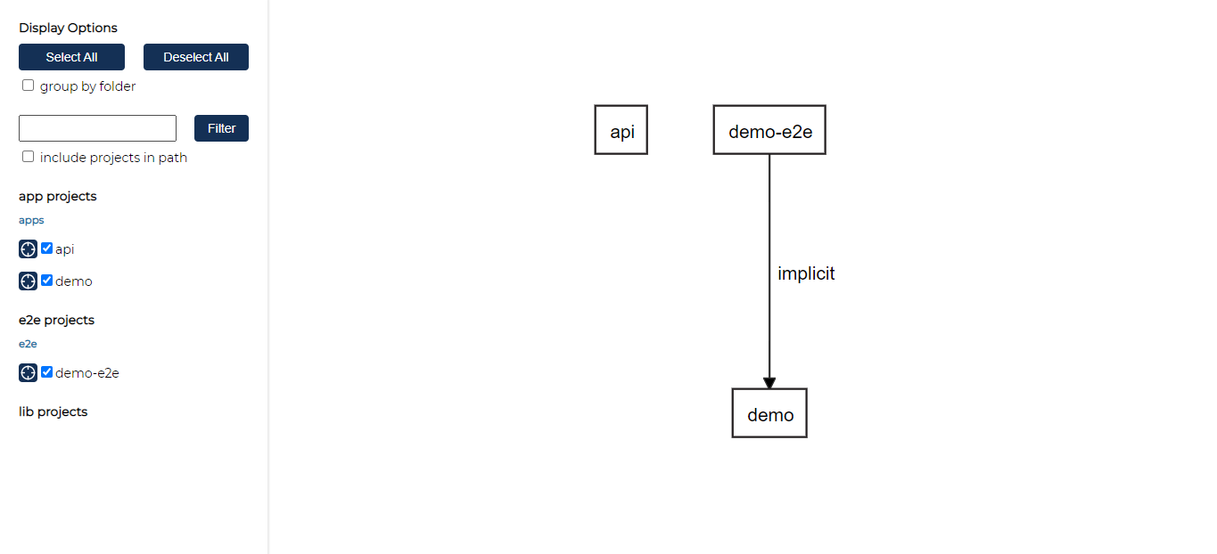 Thông thường một ứng dụng chỉ có một phần frontend và một phần backend hoặc thêm một số phần phụ trợ như e2e testing. Tuy nhiên đội ngũ phát triển hướng người sử dụng tới việc chia nhỏ ứng dụng của mình thành các module trong một workspace (có thể dưới dạng micro frontend và micoservices) cũng như tạo các thư viện và chia sẻ mã giữa các module nhằm tối ưu hóa mã nguồn, tránh việc lặp lại. Bởi vậy khi đó số lượng module sẽ rất lớn khiến việc quản lý thủ công không còn hiệu quả. Bởi vậy, Nx CLI cung cấp Dep Graph hay Dependencies Graph nhằm thể hiện một cách trực quan quan hệ giữa các module. Sau khi sử dụng câu lệnh sau npx nx dep-graph ta có thể nhìn thấy một biểu đồ dependencies được thể hiện trên trình duyệt như sau: