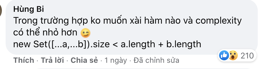 Nhưng cách giải khiến mình để ý nhất vẫn là cách giải của bạn này, nhận được vô số reaction và comment tán thưởng, thậm chí nhiều người còn thừa nhận rằng đây là cách giải tốt nhất vì không cần dùng bất kì vòng lặp nào :