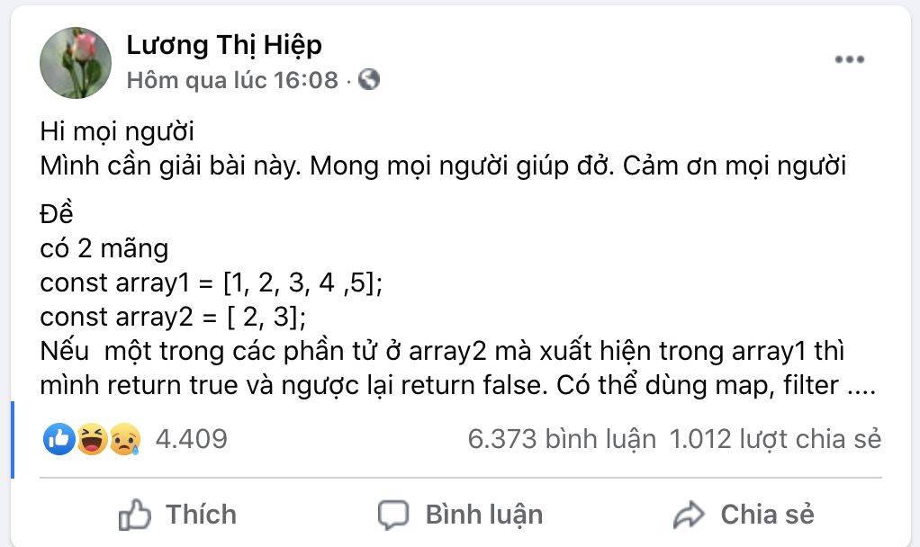 - Cách 2 có vẻ đơn giản hơn, lọc qua array2 và sau đó dùng hàm includes() để xem array1 có chứa phần tử của mảng 2 không. Performance hiệu quả hơn hẳn vì chỉ chạy vòng lặp 1 lần.