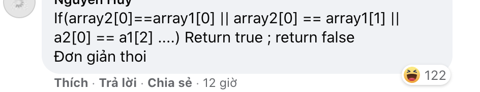 - Gán giá trị check ban đầu là true. Lọc qua từng phần tử mảng array1, mỗi vòng lặp lọc qua mảng array2, nếu có phần tử nào ở màng 2 có giá trị bằng mảng 1 thì lập tức gán check = false và return . Viết thì khá là dễ hiểu nhưng cách này thuật toán quá phức tạp, lọc qua 2 mảng thì performance tăng theo cấp số nhân, nghĩa là 2 mảng càng dài thì thời gian thực thi càng lâu.