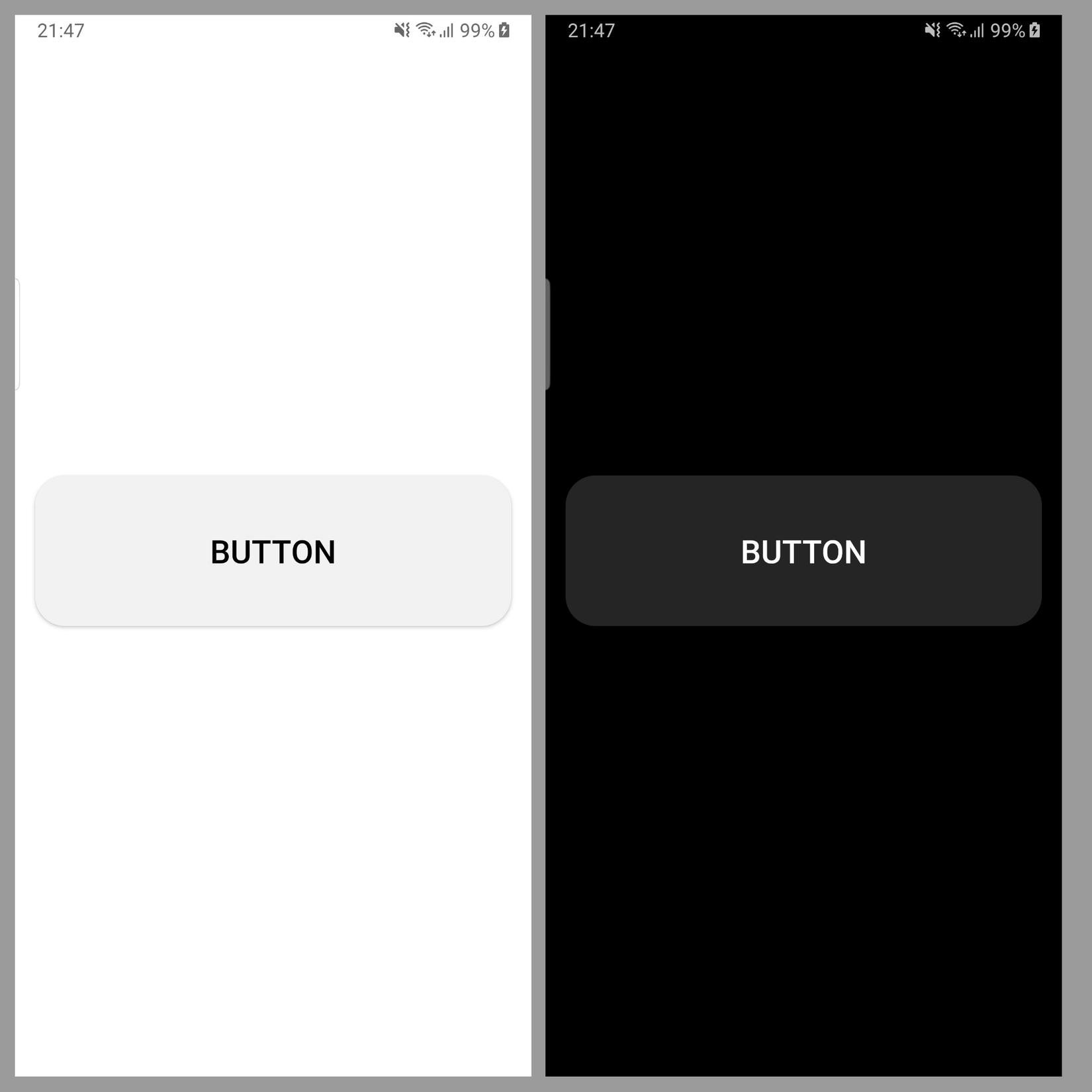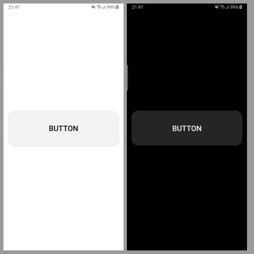 Theme giúp thay đổi chủ đề chính của ứng dụng như màu nền, màu văn bản, màu Status Bar, ... vậy còn những View được custom background thì sao? Lúc này ta sẽ cần đến 2 phiên bản Drawable cho một View. Ví dụ với 2 hình dưới đây, ở chế độ mặc định bên trái , 1 button được custom với màu đậm hơn màu nền, vậy khi chuyển sang Dark Mode, ta sẽ thay đổi background cho nó như hình bên phải.