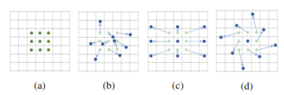 Deformable Convolution (DCN) ra đời để giải quyết nhược điểm của Conv nói trên. Conv bình thương chỉ thực hiện tính toán trên một vùng có kích thước bằng kích thước của kernel size, còn DCN sẽ tính toán trên một vùng khá tự do (Hình 4).