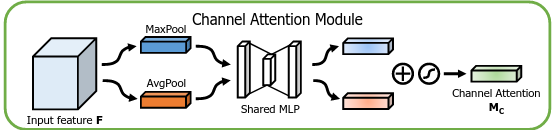 Channel Attention (Hình 8). Tương tự cách làm như SE Module, nhưng trong phần Squeeze của CBAM lại sử dụng đồng thời cả GAP và cả GMP (Global Max Pooling). Tác giả của CBAM nói rằng GMP cũng thu thập thông tin quan trọng của vật thể nhưng theo một khía cạnh khác. Sau đó, features thu được thì GMP và GAP đều được cho đi qua chung phần Excitation chứ k phải là 2 phần Excitation riêng biệt, tạo ra 2 vector. 2 Vector này sau đó được cộng vào với nhau và cũng lấy sigmoid như trong SE Module.