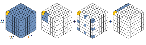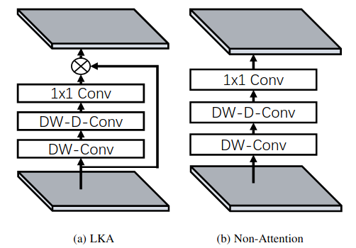 Nhưng tại sao LKA lại nhẹ? LKA đã tận dụng triệt để Depth-wise Conv (được sử dụng trong MobileNet) để cho module này vô cùng nhẹ. Ta có thể phân tách Large Kernel Conv thành 3 thành phần: Spatial Local Conv (Conv cho các vùng nhỏ) sử dụng Depth-wise Conv (DWConv), Spatial Long-range Conv (Conv để liên kết các phần xa) sử dụng Depth-wise Dilated Conv (DW-DConv) và Channel Conv/Point Wise Conv (PWConv) ( Conv). Cụ thể, một Conv có kernel sẽ được tách thành một DW-DConv với dilation rate , một DWConv và Conv (Hình 9).