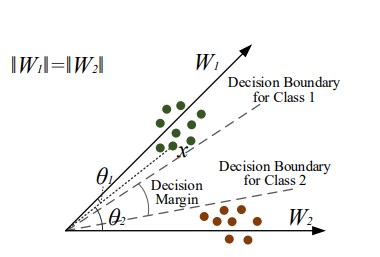 trong đó, là góc giữa 2 vector và . Trong phân lớp nhị phân sử dụng softmax los, một ảnh sẽ được phân vào lớp thứ nhất nếu hoặc . Nhưng ta cần 1 khoảng margin m giữa decision boundary của 2 class nên, tác giả paper yêu cầu . Desion boundary từ đó sẽ trở thành