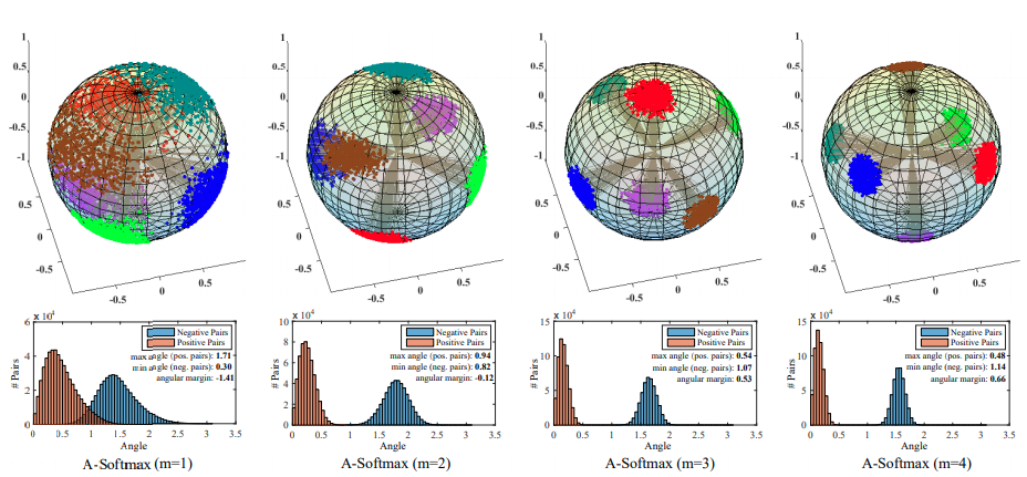 Phía trên là hình ảnh trực quan của các các vector face embedding đã được học với các giá trị m khác nhau. Hàng đầu tiên hiển thị các vector 3D được chiếu trên hình cầu đơn vị. Các điểm màu là giao điểm của vector embedding và hình cầu đơn vị. Hàng thứ hai hiển thị sự phân bố góc của cả cặp dương tính và cặp âm tính (tác giả chọn lớp 1 và lớp 2 từ tập con của dataset CASIA-WebFace để xây dựng các cặp ảnh âm tính và dương tính ). Vùng màu cam biểu thị các cặp dương tính trong khi màu xanh lam biểu thị các cặp âm tính . Giá trị các góc được tính bằng radian.
