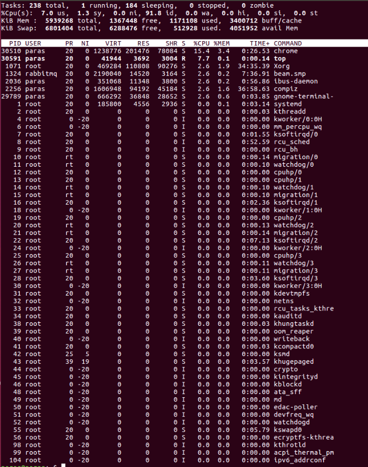 Top dùng để monitor perform của Linux. Lệnh này cũng được sử dụng để hiển thị tất cả các quy trình thời gian thực đang chạy và hoạt động trong danh sách có thứ tự và cập nhật nó thường xuyên. Nó hiển thị CPU usage, Memory usage, Swap Memory, Cache Size, Buffer Size, Process PID, User, Commands và nhiều hơn nữa... Lệnh top rất hữu ích để theo dõi hệ thống.