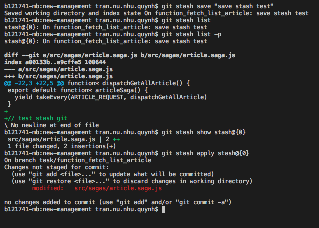 Khi muốn apply lại thay đổi từ stash nào đó: