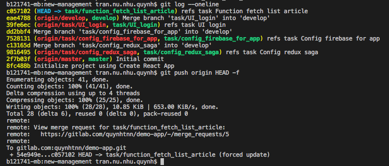 Chúng ta sẽ nhấn phím insert, di chuyển đến commit cần gộp, sửa pick thành fixup sau đó chúng ta nhấn phím esc, nhập :wq để lưu thay đổi. Sau đó tiếp hành push lên là okay nhé. Thành quả sau khi gộp: