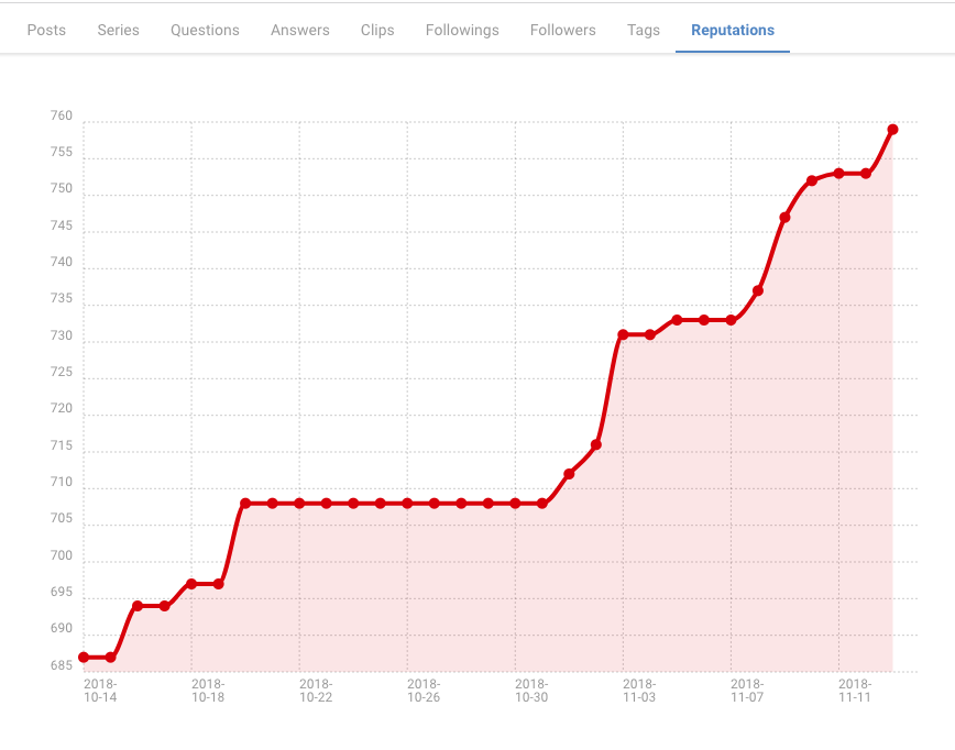 Tại trang profile của từng users, đã có thêm một tab mới là Reputations (cách thức tính Reputation của người dùng trên Viblo, các bạn có thể xem thêm tại đây). Trong tab mới Reputations này, các bạn có thể theo dõi được lịch sử biến động về chỉ số Reputation của mình, cũng như của users khác. Hãy thử check ngay biểu đồ của mình, xem gần đây mình có nhận được nhiều sự quan tâm, đánh giá tích cực từ mọi người không nhé