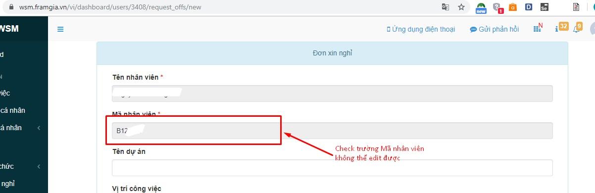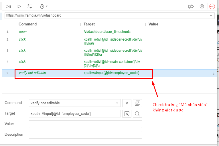 Ví dụ: Kiểm tra trường "Mã nhân viên" không edit được