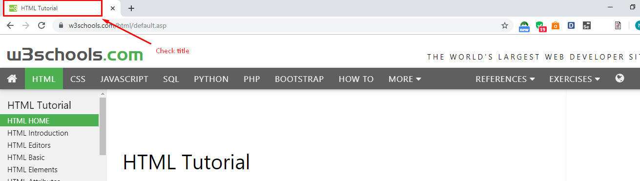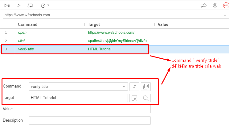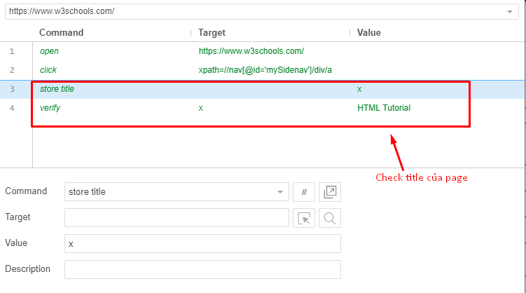 Ví dụ: Check title của page HTML trong website https://www.w3schools.com/