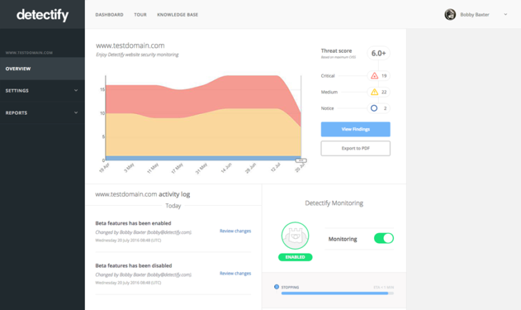 Detectify là một trình quét bảo mật tự động trên ứng dụng web dựa theo mô hình SaaS. Nó thu được hơn 100 bài kiểm thử bảo mật tự động bao gồm OWASP Top 10, các phần mềm ác ý và nhiều hơn nữa. Defectify được dùng thử 21 ngày, nếu muốn thực hiện quét bảo mật đối với trang web của mình bạn sẽ phải đăng ký.