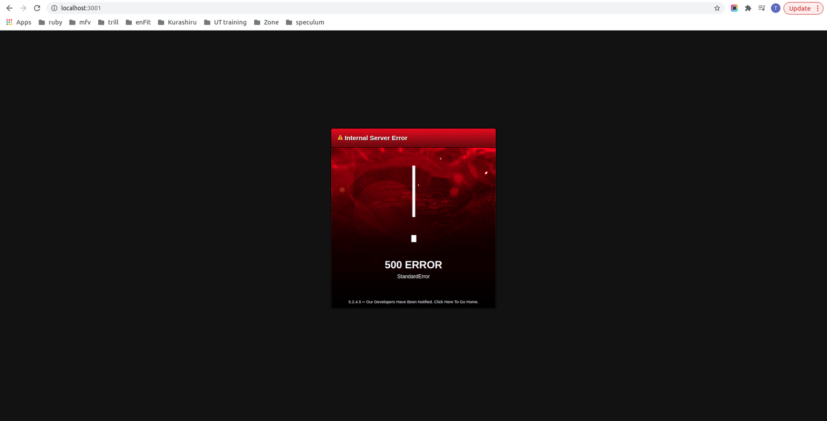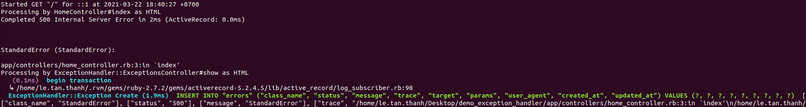 exception_handlersẽ update file schema, tạo tableerrorscó nội dung như sau# db/schema.rb create_table "errors", force: :cascade do |t| t.text "class_name" t.text "status" t.text "message" t.text "trace" t.text "target" t.text "referrer" t.text "params" t.text "user_agent" t.datetime "created_at", null: false t.datetime "updated_at", null: false end - Khi xảy ra lỗi, gem