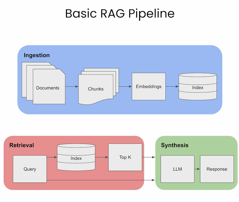 ⏩️ RAG pipeline được chia thành 3 quá trình chính: Ingestion, Retrieval, và Synthesis. Sau đây, mình sẽ mô tả sơ qua một chút: