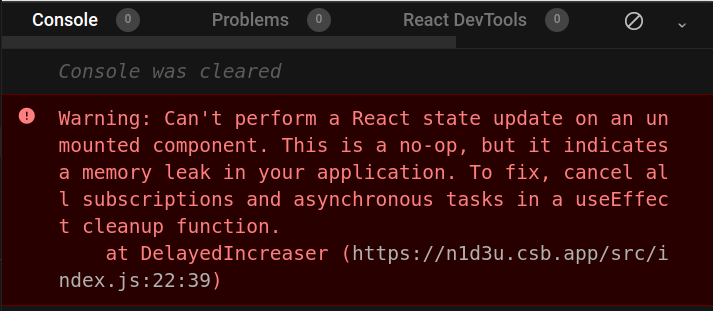 Trong khi phần tăng counter đang được thực hiện, click vào Unmount Increase button để unmount component. React sẽ cảnh báo trên console rằng bạn đang update state trong khi component đã được unmount.
