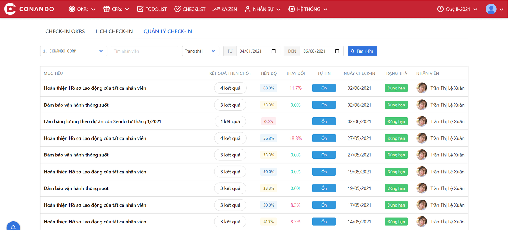 OKR là từ viết tắt của Objectives và Key Result, một phương pháp quản lý mục tiêu giúp các công ty thực hiện chiến lược và phần mềm OKR là công cụ giúp chúng ta thực hiện điều đó. Theo đó, công cụ cho phép tạo và quản lý các mục tiêu, kết quả then chốt. Lên lịch check-in thường xuyên để kiểm tra và đánh giá tình trạng thực hiện mục tiêu.