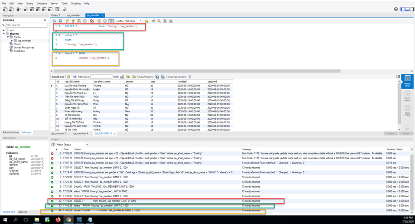 Khi thực thi đoạn mã dưới thì chỉ thực thi UPDATE thuong.qa_member set age = 20 where qa_short_name = "Thương";