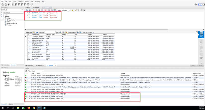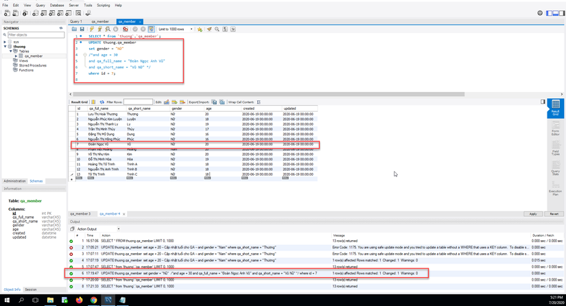 Khi thực thi đoạn mã dưới thì chỉ thực thi UPDATE thuong.qa_member set gender = "Nữ" where id = 7;