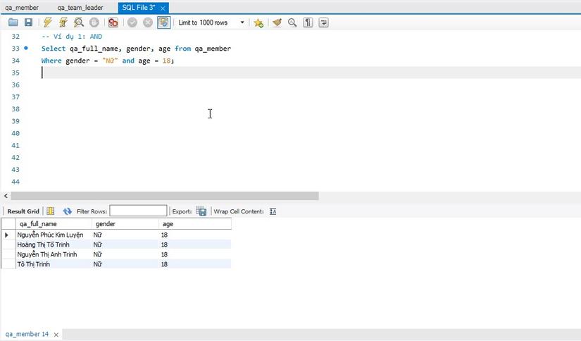 Ví dụ: Liệt kê những 'qa' Nữ có độ tuổi là 18.
