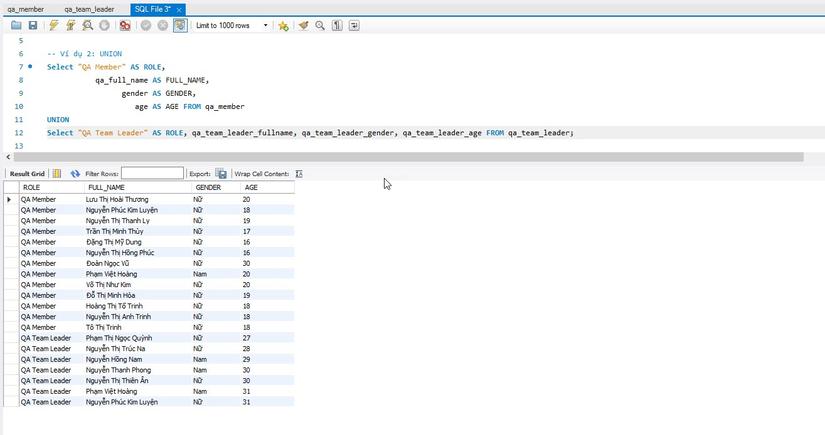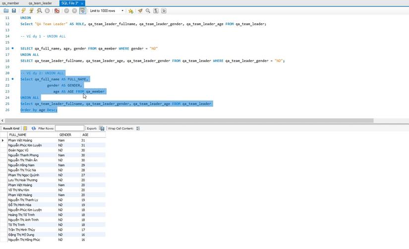 Ví dụ 2: Gộp tất cả các qa_member và qa_team_leader vào cùng một bảng (lấy các thông tin fullname, age, gender) và sắp xếp theo thứ tự giảm dần dựa trên độ tuổi