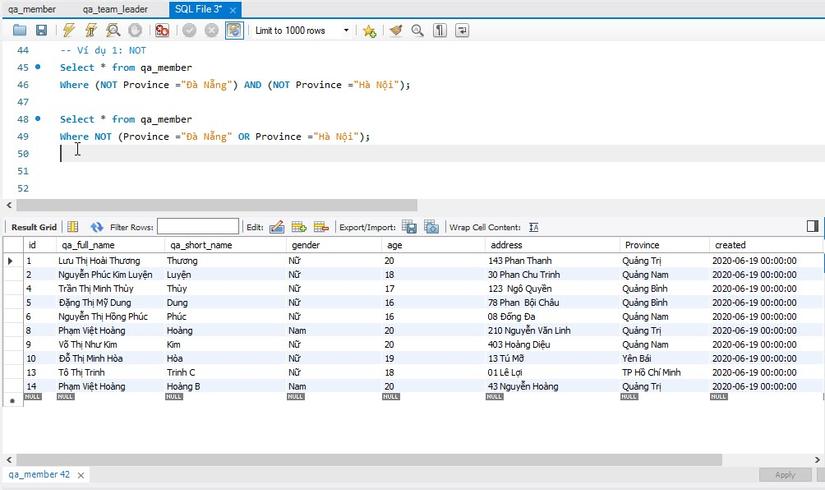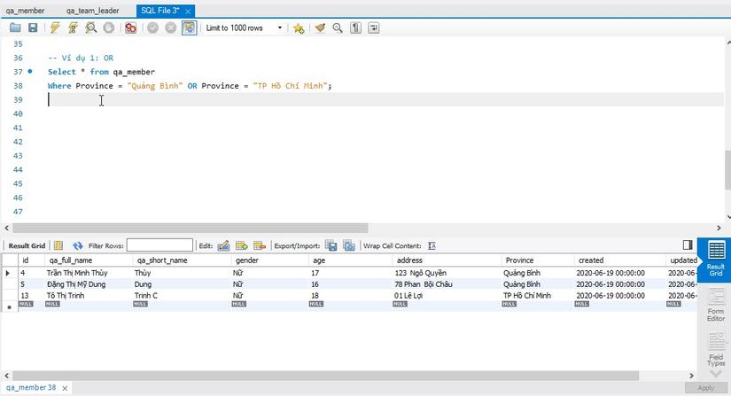 Ví dụ 1: Liệt kê những 'qa' ở 'Quảng Bình' hoặc 'TP Hồ Chí Minh'