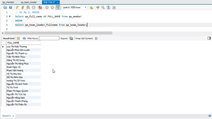 Kết quả: Liệt kê được tất cả các qa từ 2 bảng và loại bỏ những qa trùng tên.