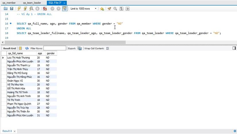 Ví dụ 1: Gộp tất cả các "qa" có giới tính Nữ vào cùng một bảng (lấy các thông tin fullname, age, gender)