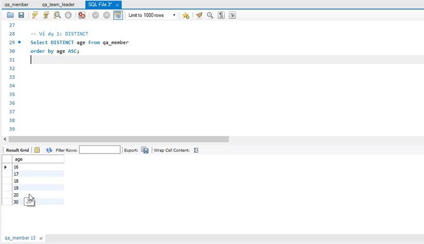 Ví dụ: List danh sách các độ tuổi trong bảng qa_member (mỗi tuổi chỉ lấy 1 lần) và sắp xếp theo thứ tự tăng dần.