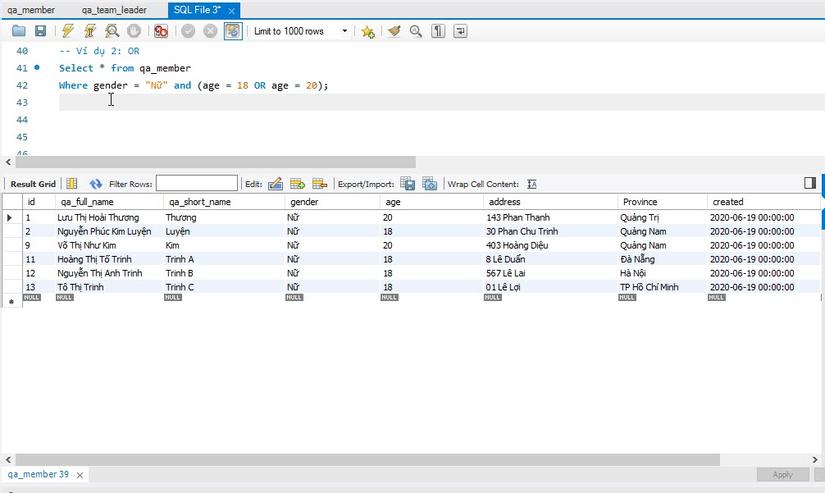 Ví dụ 2: Liệt kê những 'qa' NỮ ở độ tuổi 18 hoặc 20