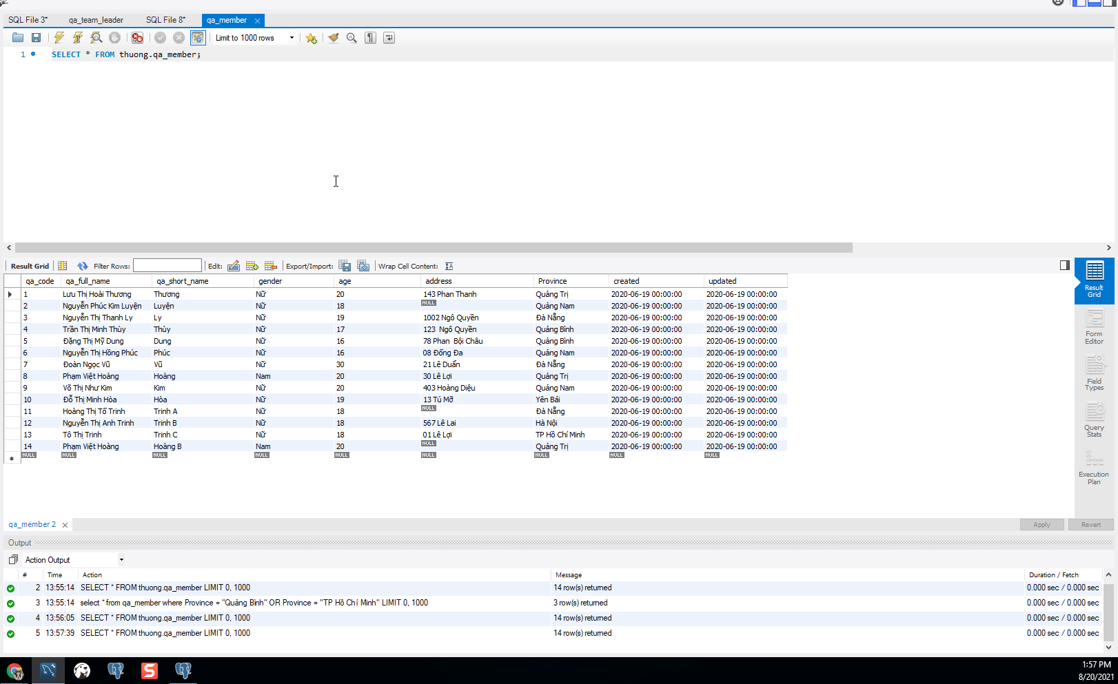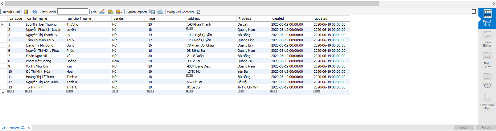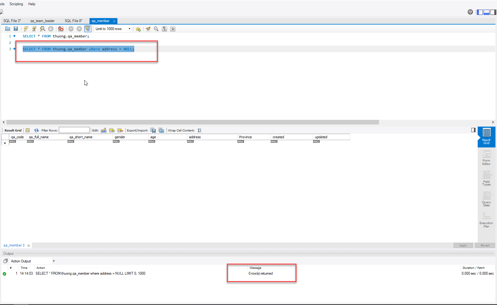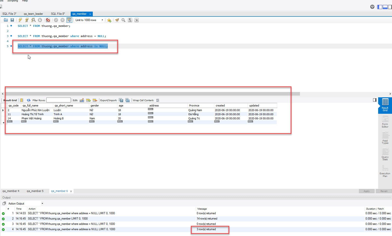 Ví dụ: Truy vấn danh sách những QA chưa có thông tin address theo bảng dữ liệu sau: