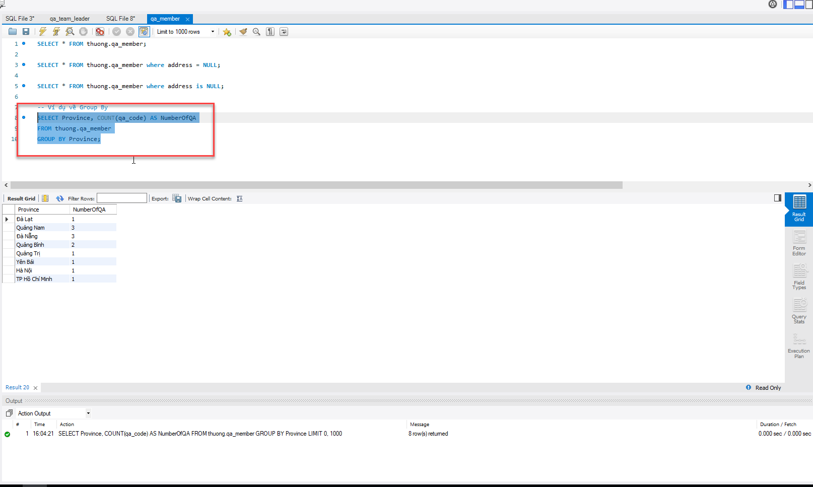 Truy vấn số lượng QA ở mỗi tỉnh (Province) theo bảng dữ liệu sau: