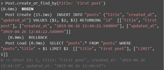 Rails có find_or_create_by, find_by và các phương thức tương tự để tìm giá trị đầu tiên và tạo nếu không tìm thấy bản ghi khớp với các tham số đã cho.